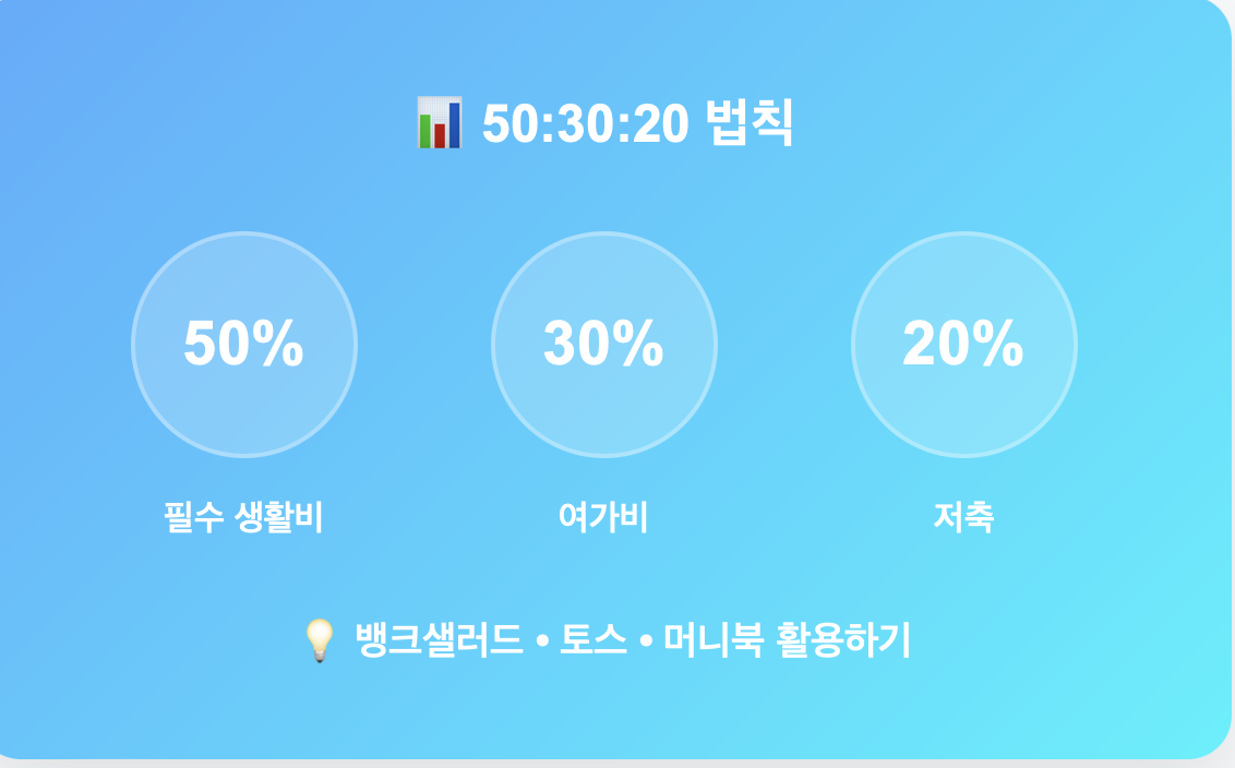 소득보다 중요한 건 지출 파악입니다. 50:30:20 법칙 (필수비:욕구비:저축)을 기반으로 예산을 정해보세요.